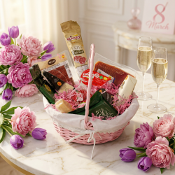 Подарочная корзина к 8 Марта — изысканный гастрономический комплимент, созданный для того, чтобы подчеркнуть утончённость момента и выразить особое внимание.