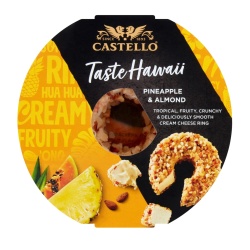 Нежный сливочный сыр в форме кольца с кусочками ананаса и миндаля — яркое сочетание тропической сладости, лёгкой хрустящей текстуры и деликатного сливочного вкуса.