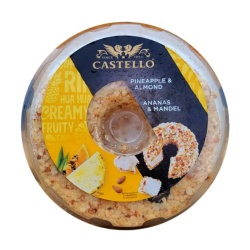 Нежный сливочный сыр в форме кольца с кусочками ананаса и миндаля — яркое сочетание тропической сладости, лёгкой хрустящей текстуры и деликатного сливочного вкуса.